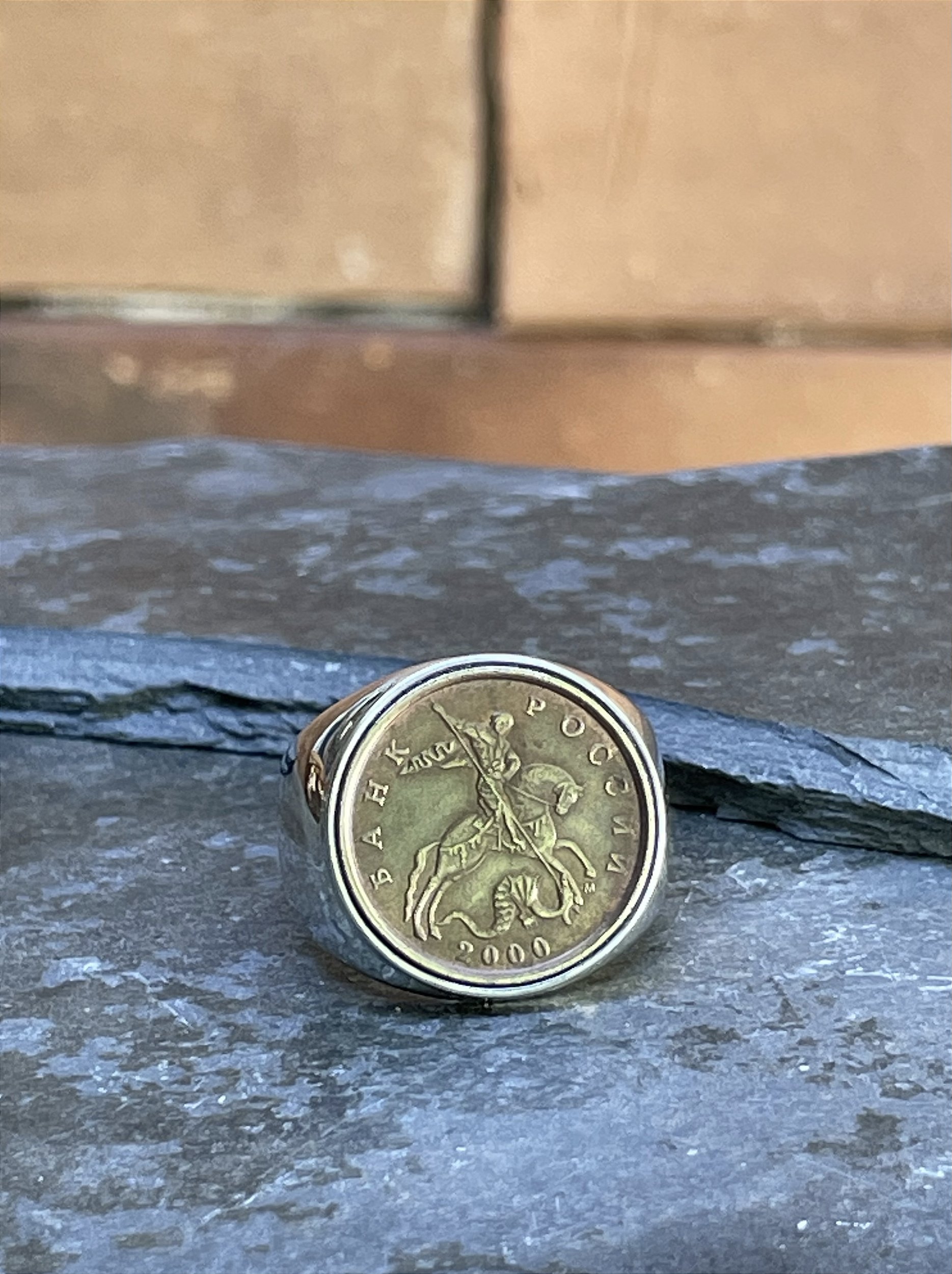 Anel Sinete Maciço em Prata com Moeda Russa - Homenagem a São Jorge
